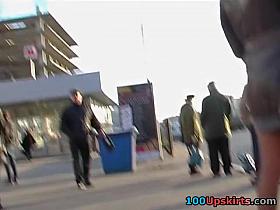 Asian babe waiting for friends gets a skirt sharking.