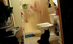 Spy camera in bathroom catches teen with small round boobs undressing before shower and drying her body after shower.