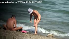 Nudist on the beach with big boobs is taking a shower