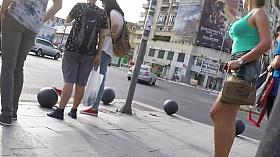 A thin white woman walking alone down the street in a white top and a jean skirt is being followed by a spy cam. She stops at a light, walks by some construction workers and up some steps. Her ass is small and attractive.