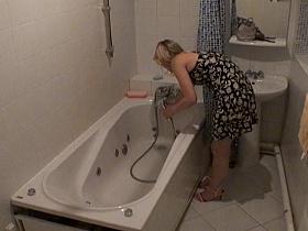 Toilet sharking surprise with brown-haired pretty vixen being totally stunned