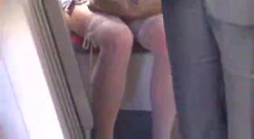 Wife Dressed Like A Slut In Stockings Miniskirt and High Heels Flashing Her Cunt