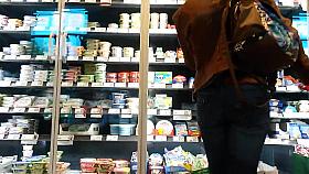 Woman wearing low jeans pants has her blue g string panties secretly filmed at local clothes store.