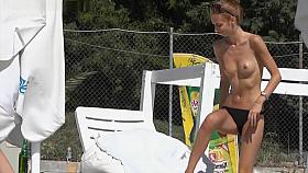 Busty babes are not wearing their bikini tops at the beach