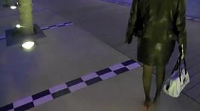 Girl in fishnet stockings and black leather boots in a bus