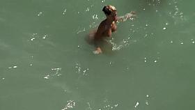Plump dreamy babe loses her bottom part when some sharking fella snatches it