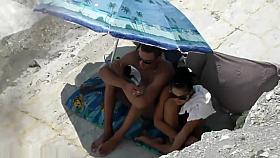 Busty nudist gives head in beach