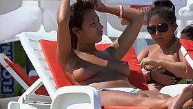 Topless chick in window