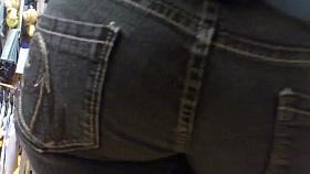 A public upskirt voyeur clip of a girl's bum in black thong