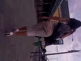 Round ass redhead with long hair wearing dark gray leggings in the bus.