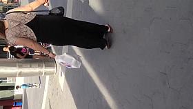 Voyeur was circling around this charming woman until he got what he wanted and that was a nice and clear upskirt view. He took a peek under that black skirt with colored motives on it and proceeded further, no harm done to anyone.