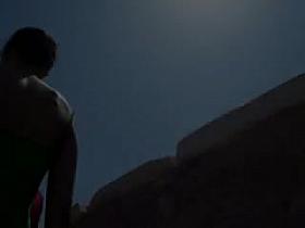 Black hair woman waits on the street while a voyeur films her underskirt ass