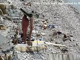 Mature nudist woman with small tits and fat shaved pussy refreshes in the water and sunbathes her body. Her horny husband joins her and fucks her pussy while she rubs her clitoris.