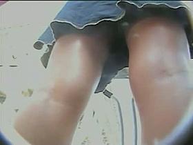 Upskirt scene with lady in short skirt, stockings and hessian boots