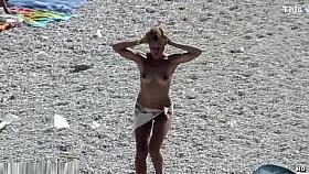 Voyeur spies on a perky breasted MILF on a nudist beach