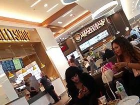 Flashing pierced pussy and tits in cafe