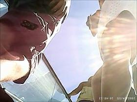 Hot view up a blond girls white mini skirt showing panties