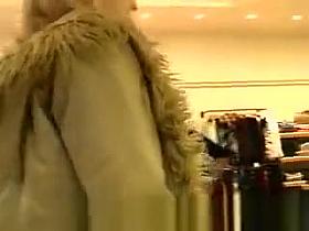 Hot sexy legs woman in blue top and white short skirt goes shopping wearing no panties. She flashes her pussy and tits and bents over to expose her pussy to the cam.