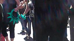 White black haired teen goes on her knees and blowjobs the LP Officer swallowing his rod deep dwon her throat