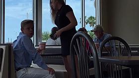 Blonde slut in red panties crossing a bridge with friends upskirt
