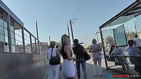 Upskirt in bus(try to knee to push her legs)